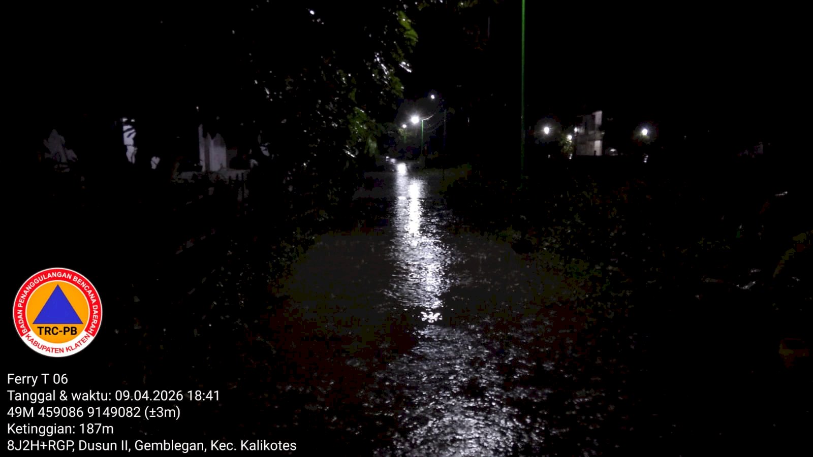 Hujan dengan intensitas lebat yang terjadi pada Kamis (9/4/2026) sekitar pukul 14.00 WIB mengakibatkan Dk Prigi Kulon RT 01/ RW 06 Desa Gemblegan, Kecamatan Kalikotes terjadi limpasan air dari Sungai irigasi persawahan yang meluap hingga masuk ke area pemukiman.