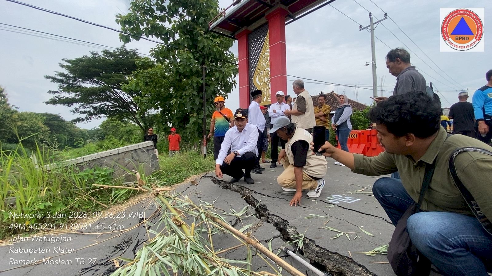 KLATEN - Bupati Klaten, Hamenang Wajar Ismoyo bergerak cepat menindaklanjuti amblasnya jembatan Gempol IV yang ada di perbatasan Desa Karangturi, Kecamatan Gantiwarno dan Desa Kadilanggon, Kecamatan Wedi, Klaten, pada, Sabtu (03/01/2026). Bupati berupaya perbaikan jembatan dilakukan secepatnya.