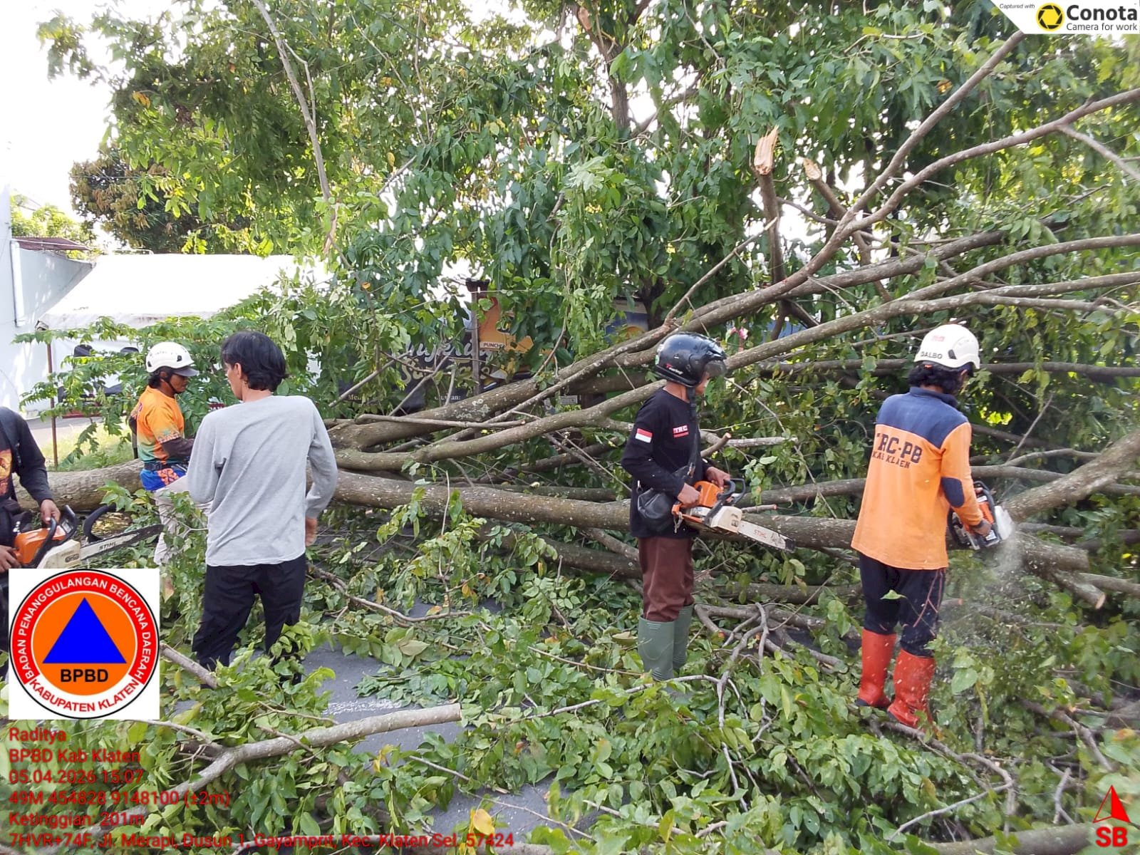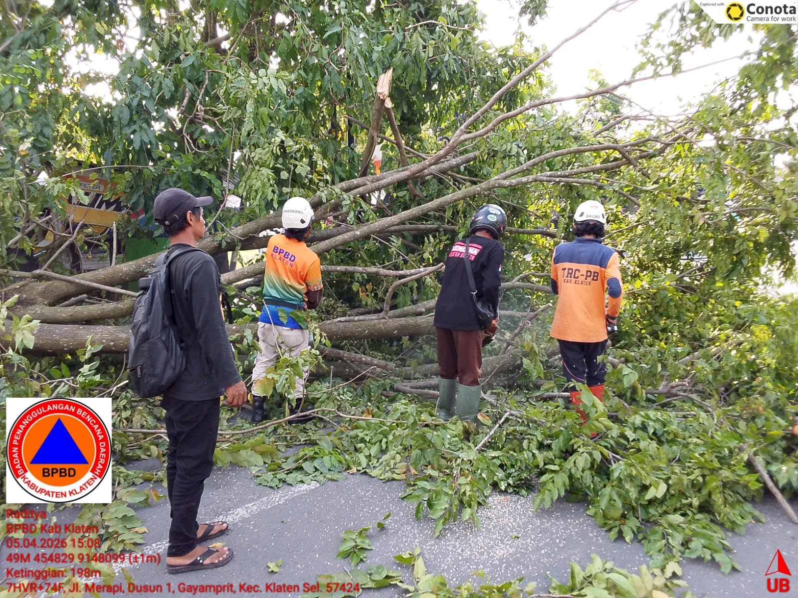 KLATEN - Pada Minggu, 5 April 2026, terjadi kejadian pohon tumbang yang menutup akses jalan depan Merapi Resto, Desa Tegalyoso, Kecamatan Klaten Selatan. Kejadian terjadi sekira pukul 14.15 WIB, di mana angin kencang dan kondisi pohon sudah lapuk menyebabkan pohon tumbang menutupi akses jalan.