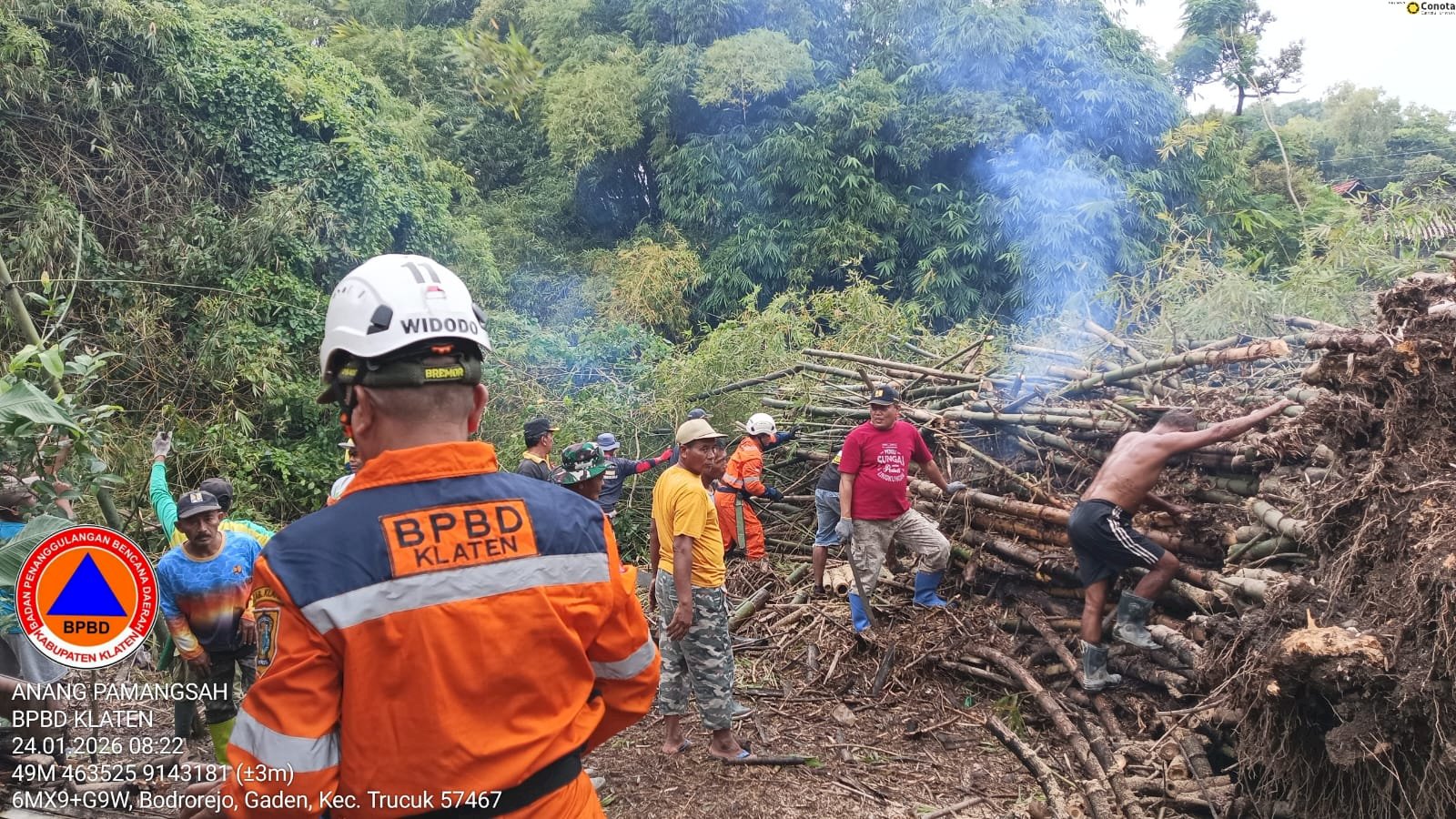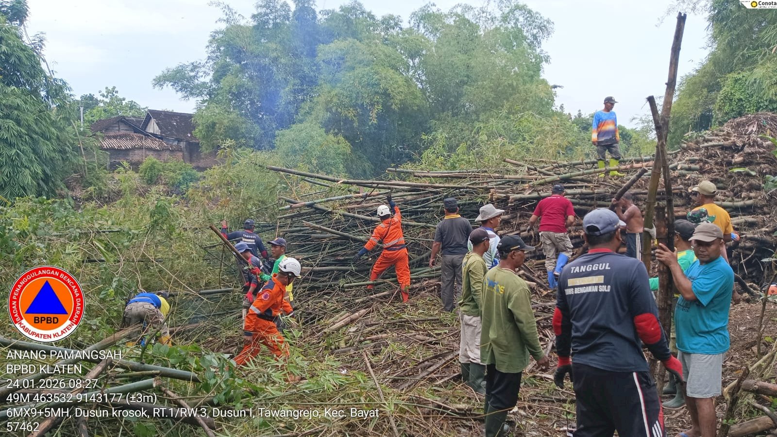 KLATEN - Sabtu (24/01/2026) BPBD Kabupaten Klaten berpartisipasi pada gotong royong pembersihan rumpun bambu roboh ke aliran Sungai Dengkeng di Dukuh Jeto RT 31/ RW 10, Desa Gaden, Kecamatan Trucuk.