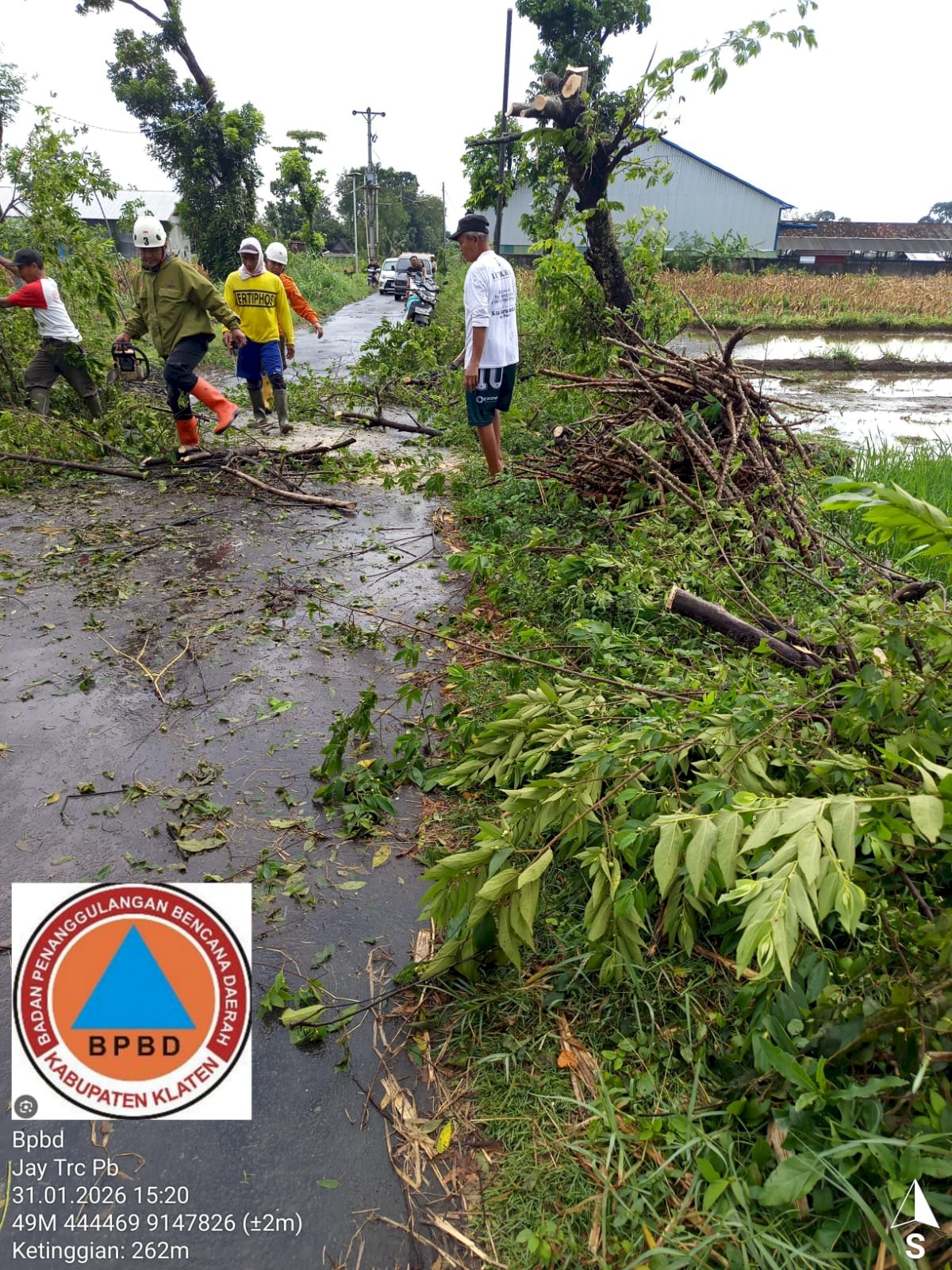 Badan Penanggulangan Bencana Daerah (BPBD) Kabupaten Klaten dan Tim Reaksi Cepat (TRC) Penanggulangan Bencana (PB) dari Kecamatan Manisrenggo, Kabupaten Klaten segera bergerak untuk menangani kejadian ini dan segera melakukan koordinasi untuk pemotongan pohon yang tumbang, pembersihan jalan, serta dokumentasi kejadian. Penanganan telah selesai dilakukan, dan tidak menimbulkan korban jiwa maupun kerugian lainnya.