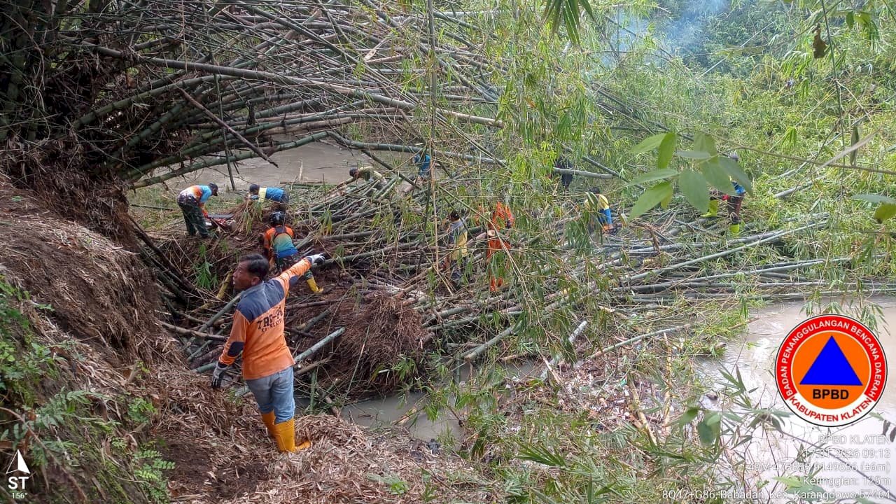 KLATEN - Sabtu (17/01/2026) BPBD Kabupaten Klaten berpartisipasi pada gotong royong pembersihan rumpun bambu roboh di Dukuh Babadan RT 08/ RW 04 Desa Babadan, Kecamatan Karangdowo.