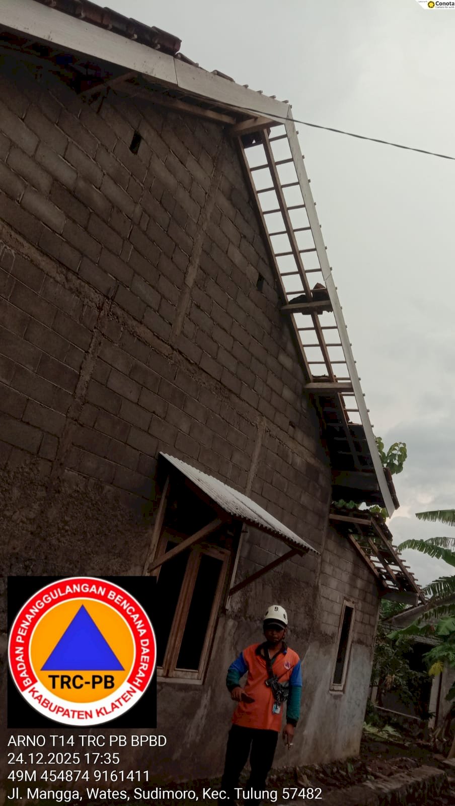 Hujan deras disertai angin kencang mulai mengguyur Kecamatan Tulung sekitar pukul 15.00 WIB. Informasi adanya pohon tumbang dan kerusakan rumah warga diterima Tim BPBD sekitar pukul 16.45 WIB, sehingga tim langsung bergerak untuk melakukan penanganan awal dan pendataan.