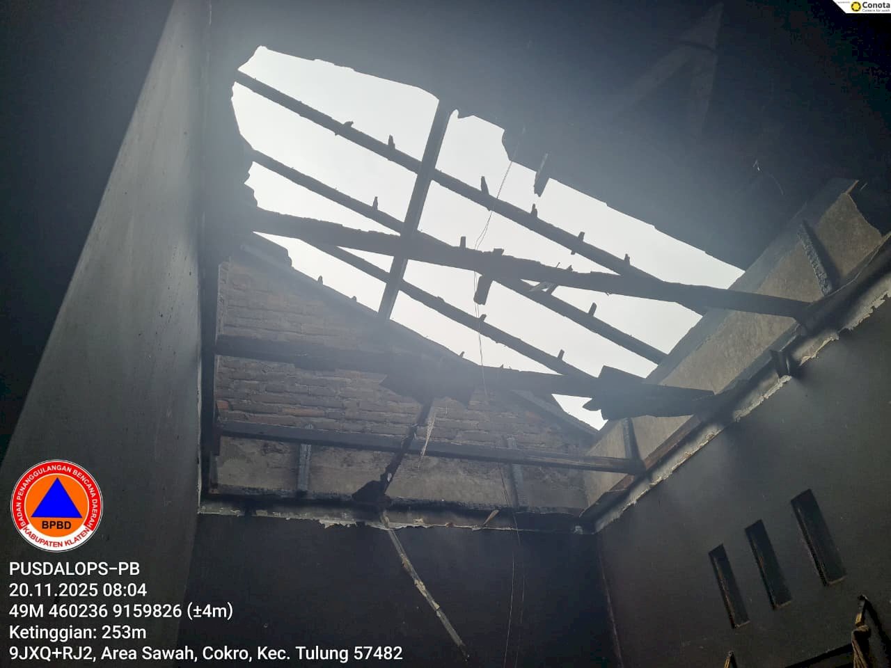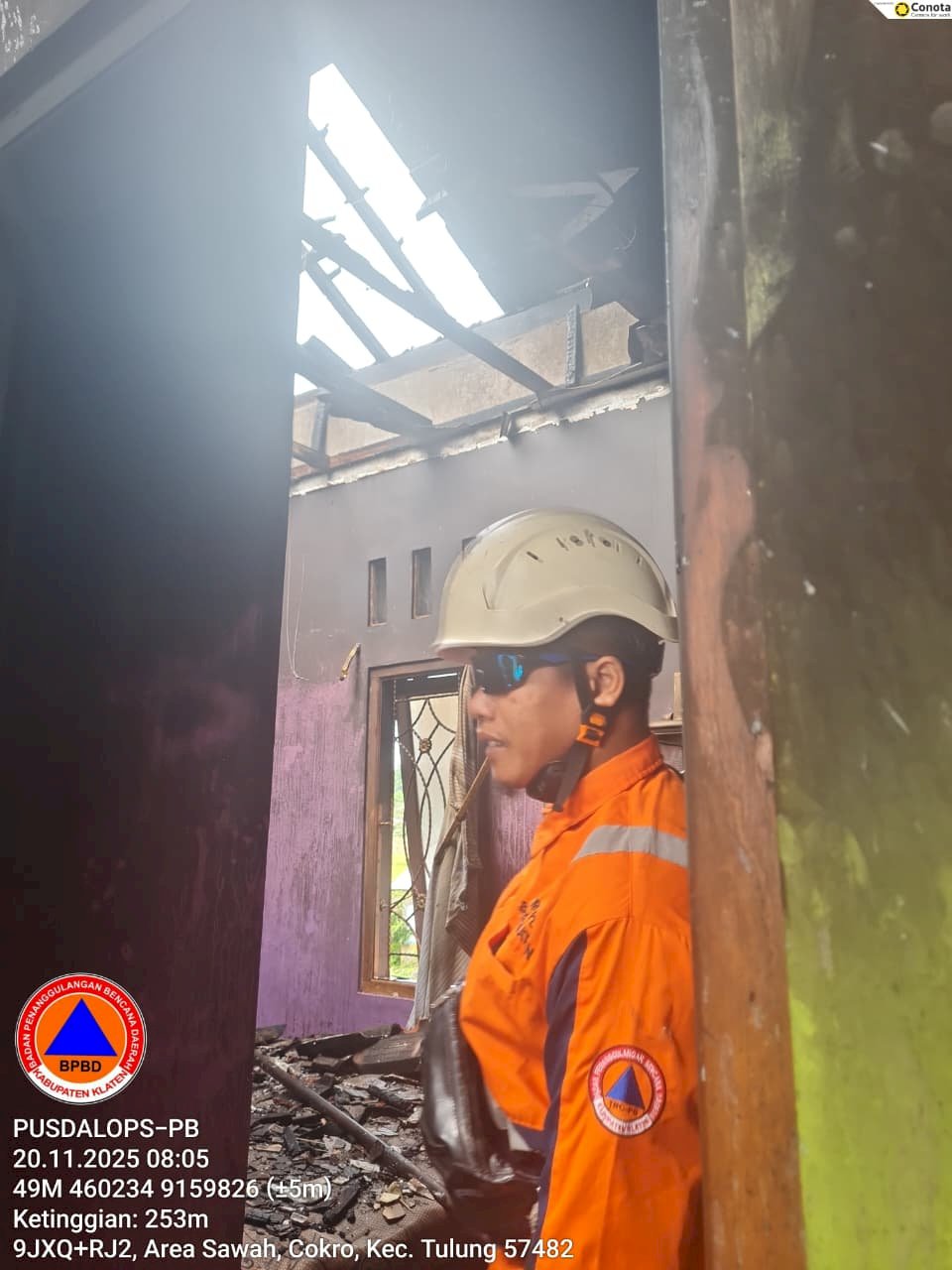 KLATEN - Sebuah rumah di Dukuh Cokro RT 16/ RW 05 Desa Cokro, Kecamatan Tulung, terbakar pada Kamis (20/11/2025) sekitar pukul 06.30 WIB. Rumah tersebut ditempati oleh Bapak Agus Bandono (59), warga setempat.