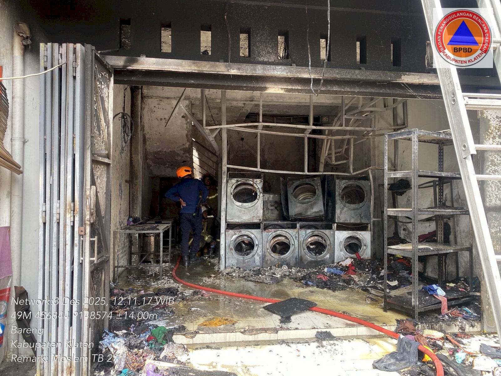 KLATEN - Sebuah tempat usaha laundry yang terletak di Jl Prenjak No 29, Dukuh Mojorejo RT 03/ RW 07, Desa Bareng, Kecamatan Klaten Tengah mengalami kebakaran pada Senin (8/12/2025) siang sekitar pukul 11.20. Dua orang yang bekerja di tempat tersebut melihat percikan api dari mesin laundry (pengering pakaian menggunakan gas) api tiba tiba membesar lalu menyambar ke mesin laundry dan pakaian di sekitarnya.