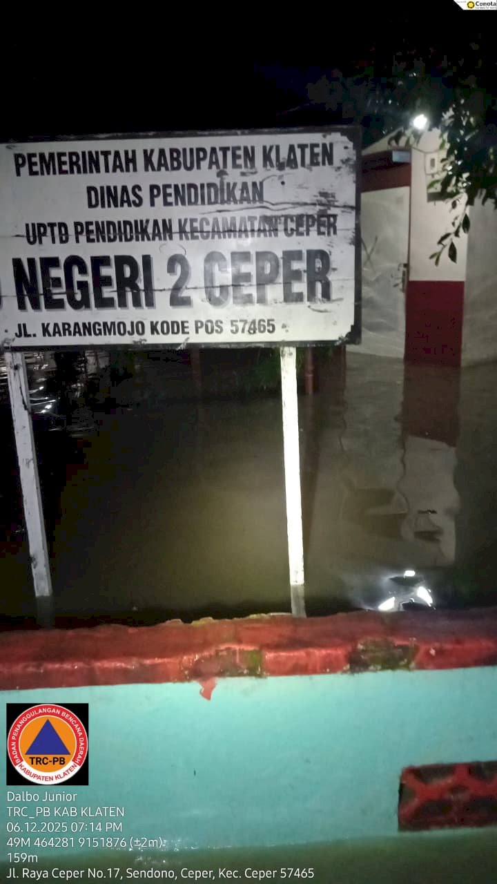 KLATEN - Hujan dengan intensitas sedang hingga lebat yang mengguyur wilayah Kecamatan Ceper pada Sabtu (6/12/2025) menyebabkan luapan air dari gorong-gorong yang berujung pada genangan/banjir di akses jalan depan SDN 2 Ceper. Bencana terjadi sekitar pukul 17.00 WIB, tepatnya di Dusun Karangmojo San Pason, Desa Ceper, Kecamatan Ceper.