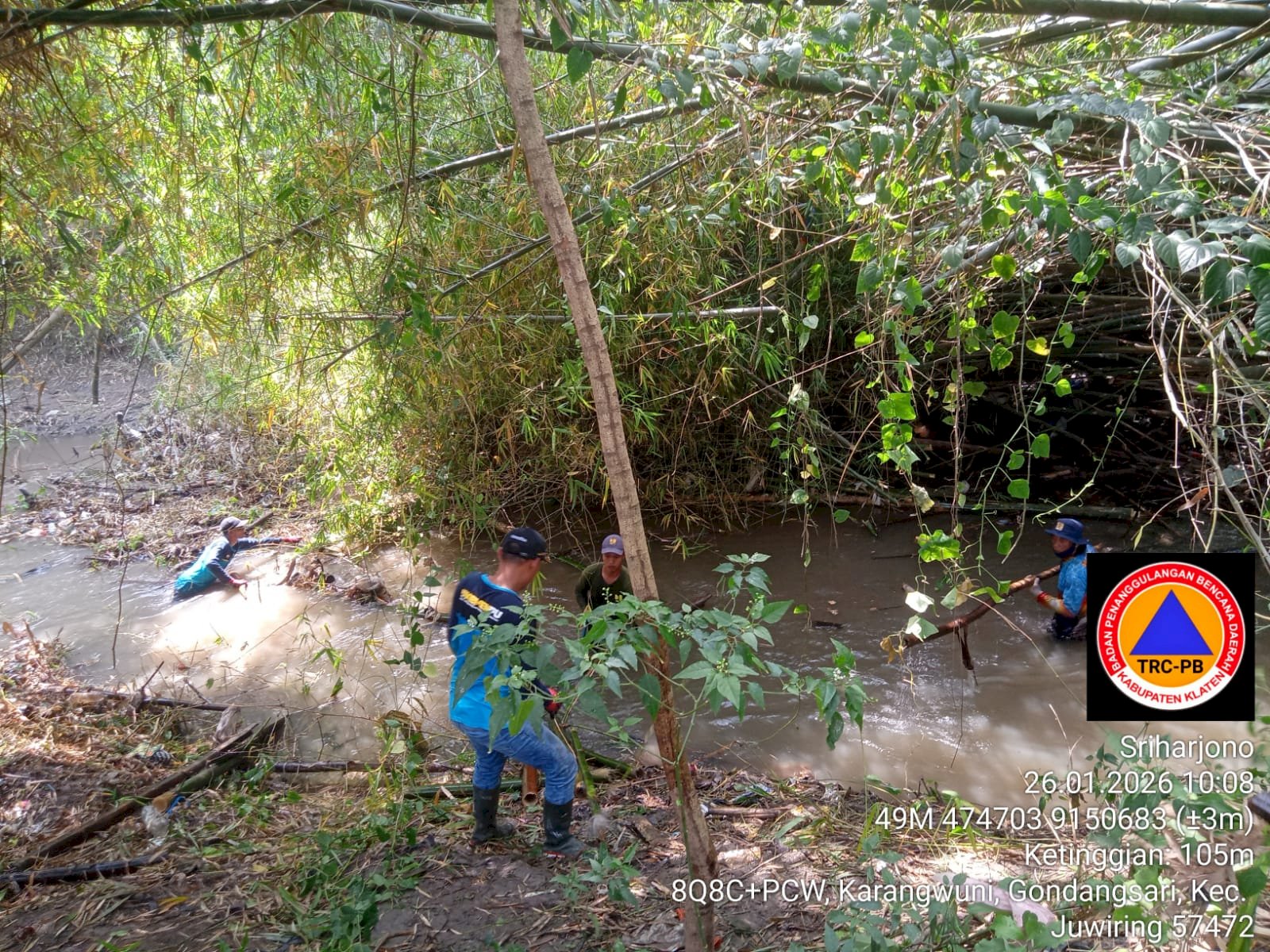 KLATEN - Senin (26/01/2026) BPBD Kabupaten Klaten berpartisipasi pada gotong royong pembersihan rumpun bambu roboh ke aliran Sungai Blora di Dukuh Losari RT 14/ RW 05, Desa Gondangsari, Kecamatan Juwiring.
