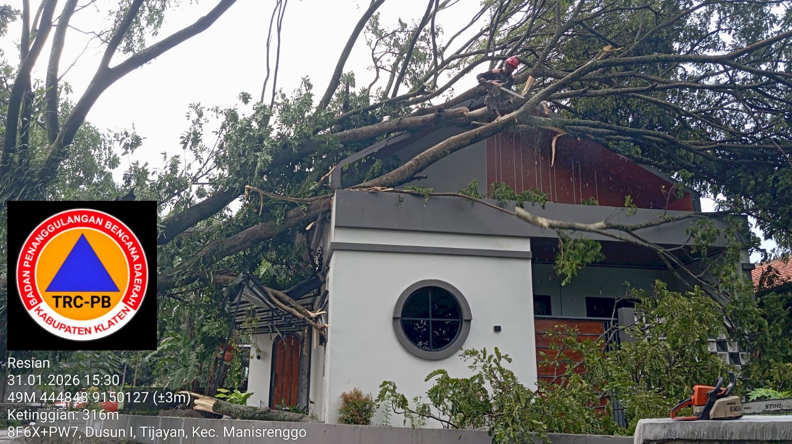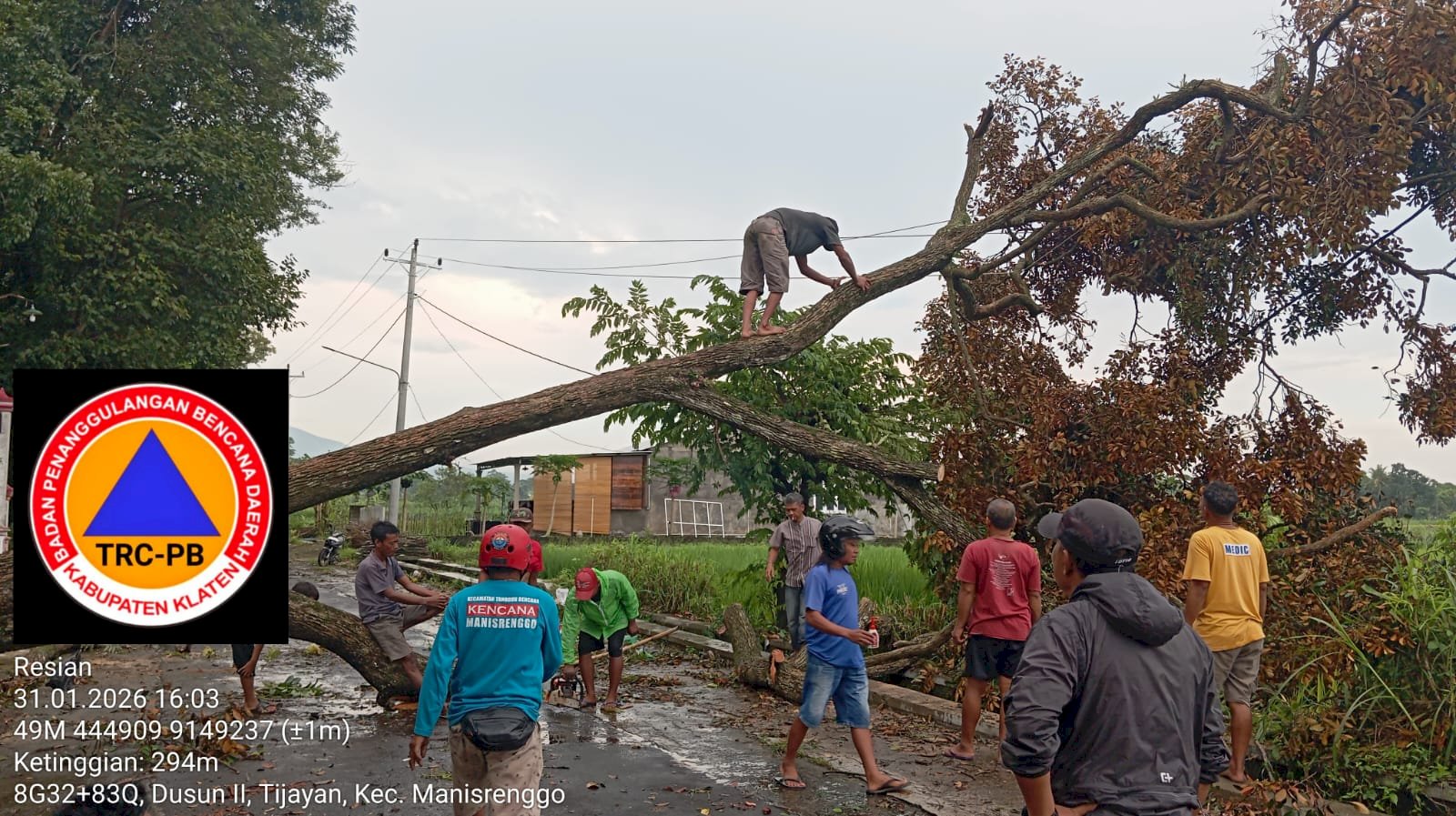 KLATEN - Pada Sabtu, 31 Januari 2026, terjadi kejadian pohon tumbang yang menimpa rumah dan menutup akses jalan di Desa Tijayan, Kecamatan Manisrenggo. Kejadian terjadi pada pukul 14.45 WIB, di mana angin kencang menyebabkan pohon menjadi tumbang.