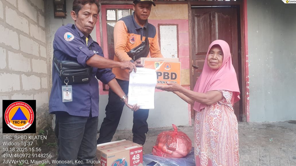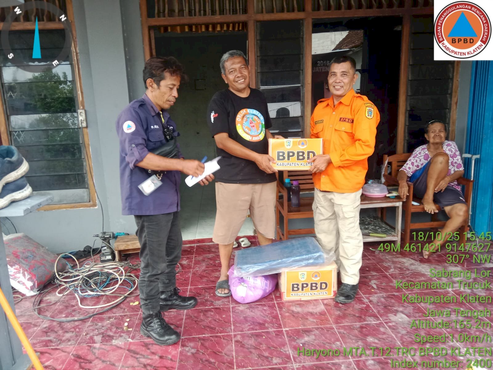 Tim Reaksi Cepat (TRC) BPBD Kabupaten Klaten menyerahkan bantuan logistik kepada warga terdampak angin kencang di desa Sabranglor dan desa Wonosari, kecamatan Trucuk, Sabtu (18/10/2025). Bantuan ini merupakan tindak lanjut dari kejadian angin kencang pada Jum'at malam, 17 Oktober 2025. Dalam insiden tersebut, tidak ada korban jiwa.