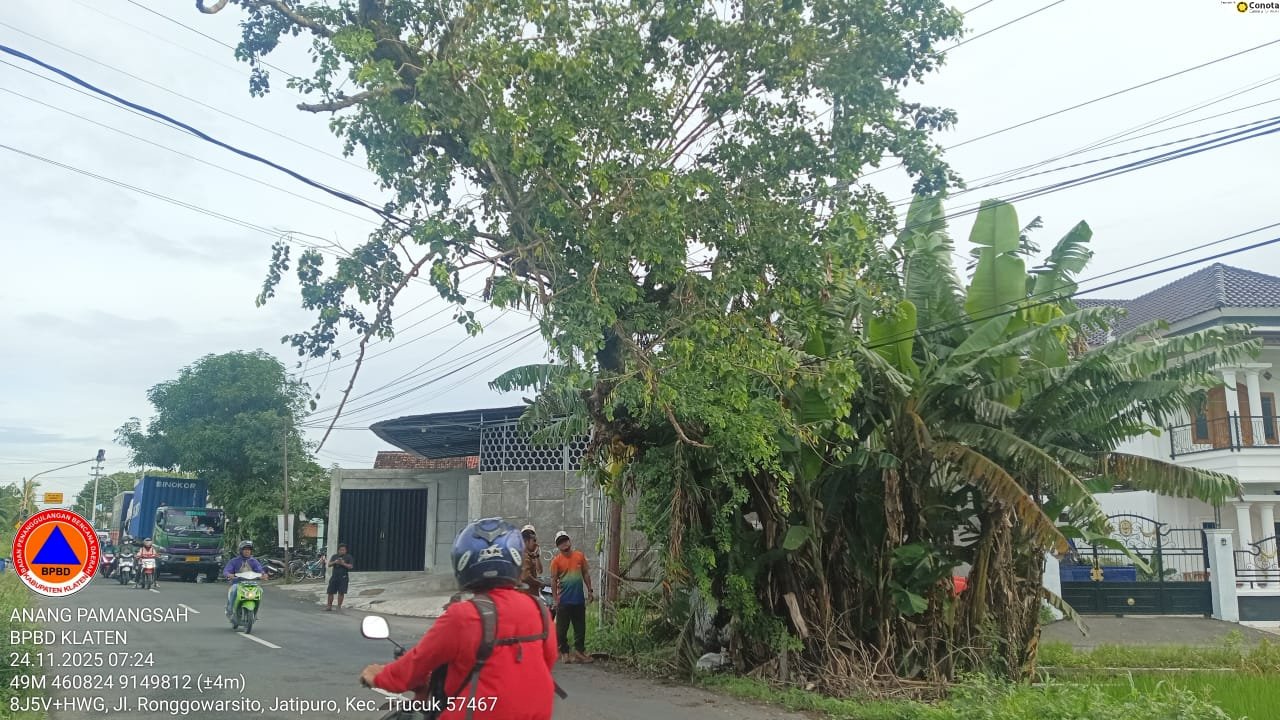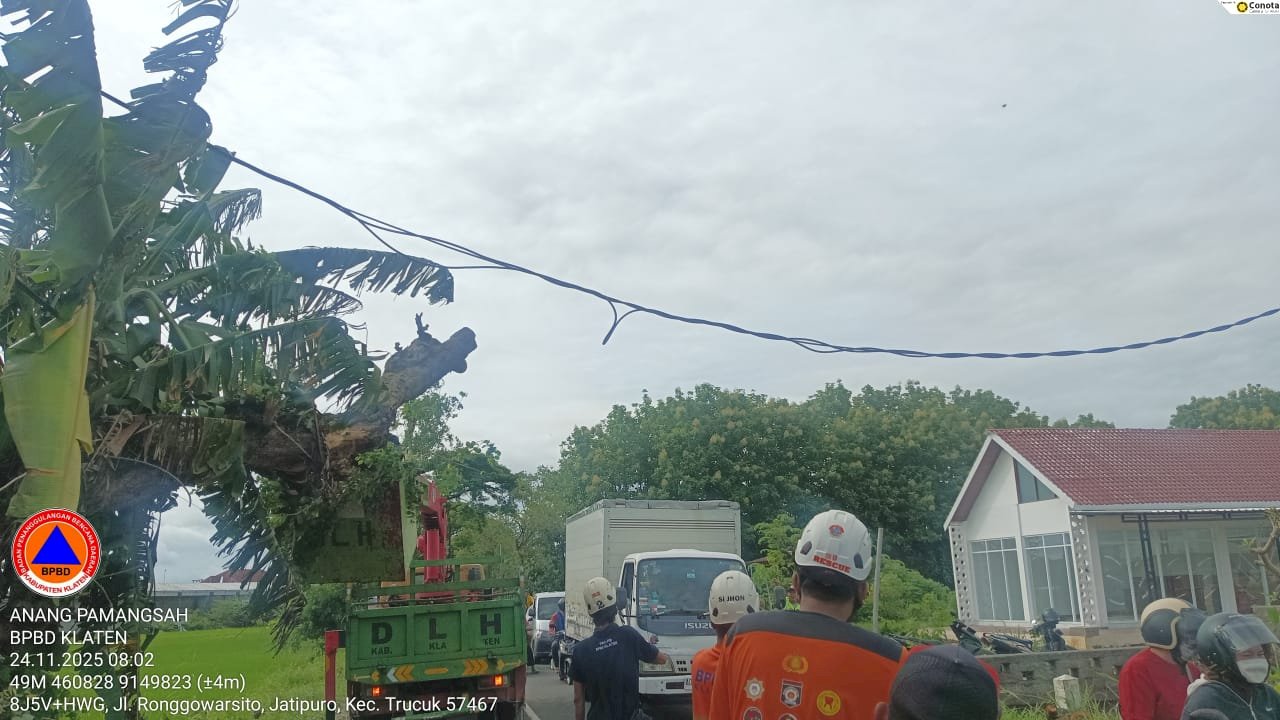 KLATEN – Akibat akar pohon sudah lapuk, pohon jenis Sono Keling tumbang menimpa kabel listrik di Dukuh Jatipuro RT 01/ RW 10, Desa Jatipuro, Kecamatan Trucuk pada Senin pagi (24/11/2025).