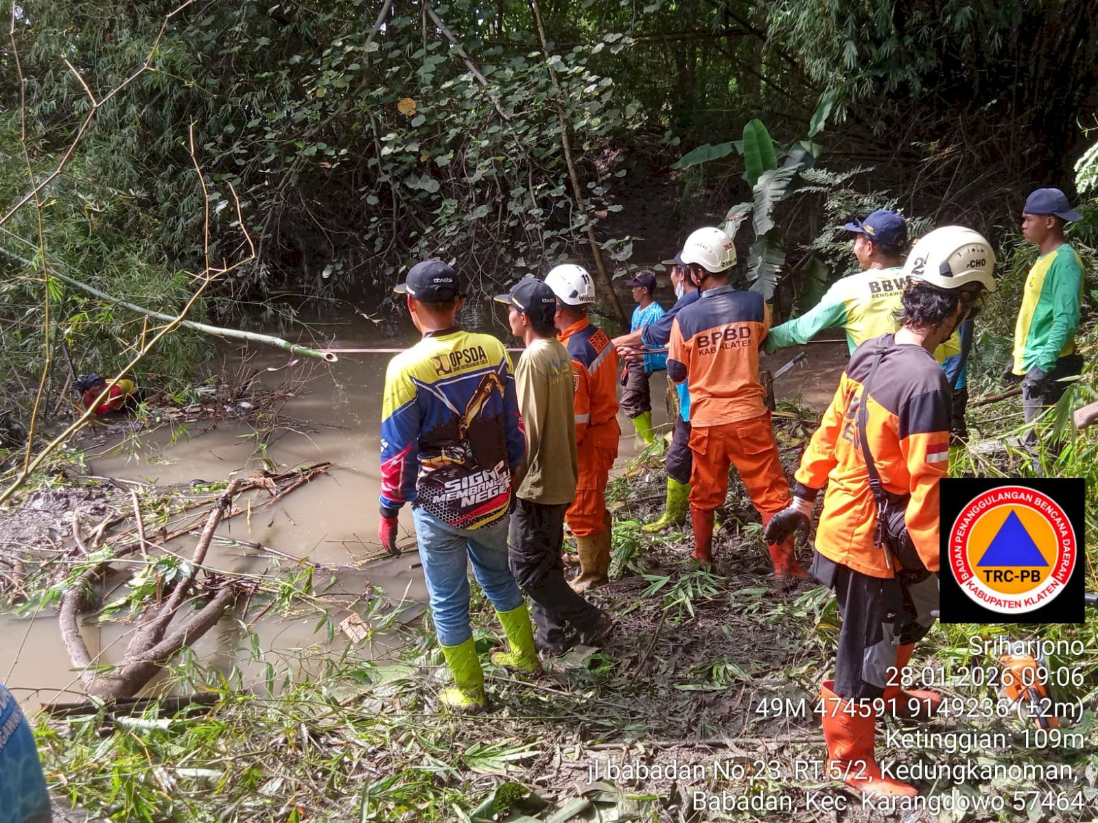 Gotong royong pembersihan ini melibatkan personil dari BPBD bersama dengan BBWS Bengawan Solo, Relawan Karangdowo, Pemerintah Desa Babadan, Camat Cawas, TNI, Polri, dan Warga masyarakat.