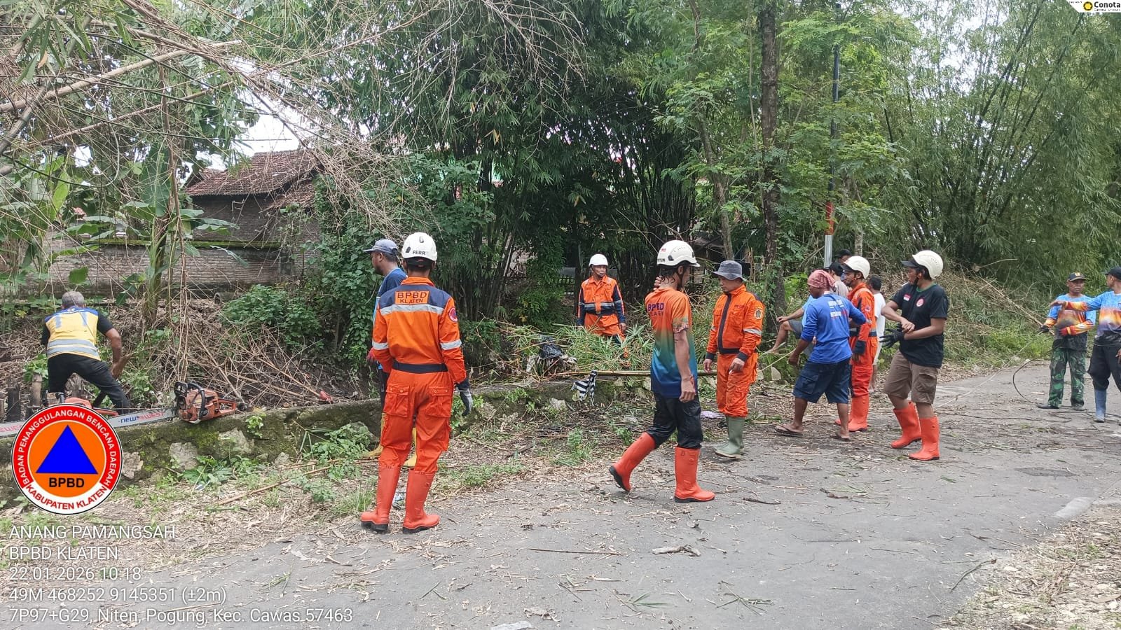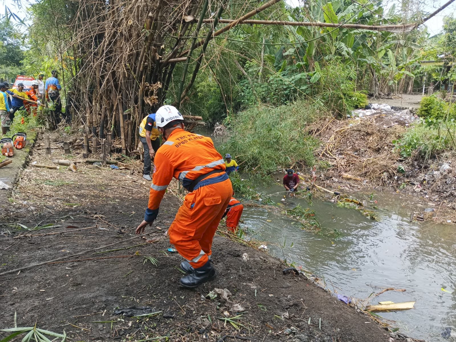 KLATEN - Kamis (22/01/2026) BPBD Kabupaten Klaten berpartisipasi pada gotong royong pembersihan rumpun bambu roboh ke aliran Sungai Cino di Dukuh Karangjati RT 02/ RW 08, Desa Gombang, Kecamatan Cawas.