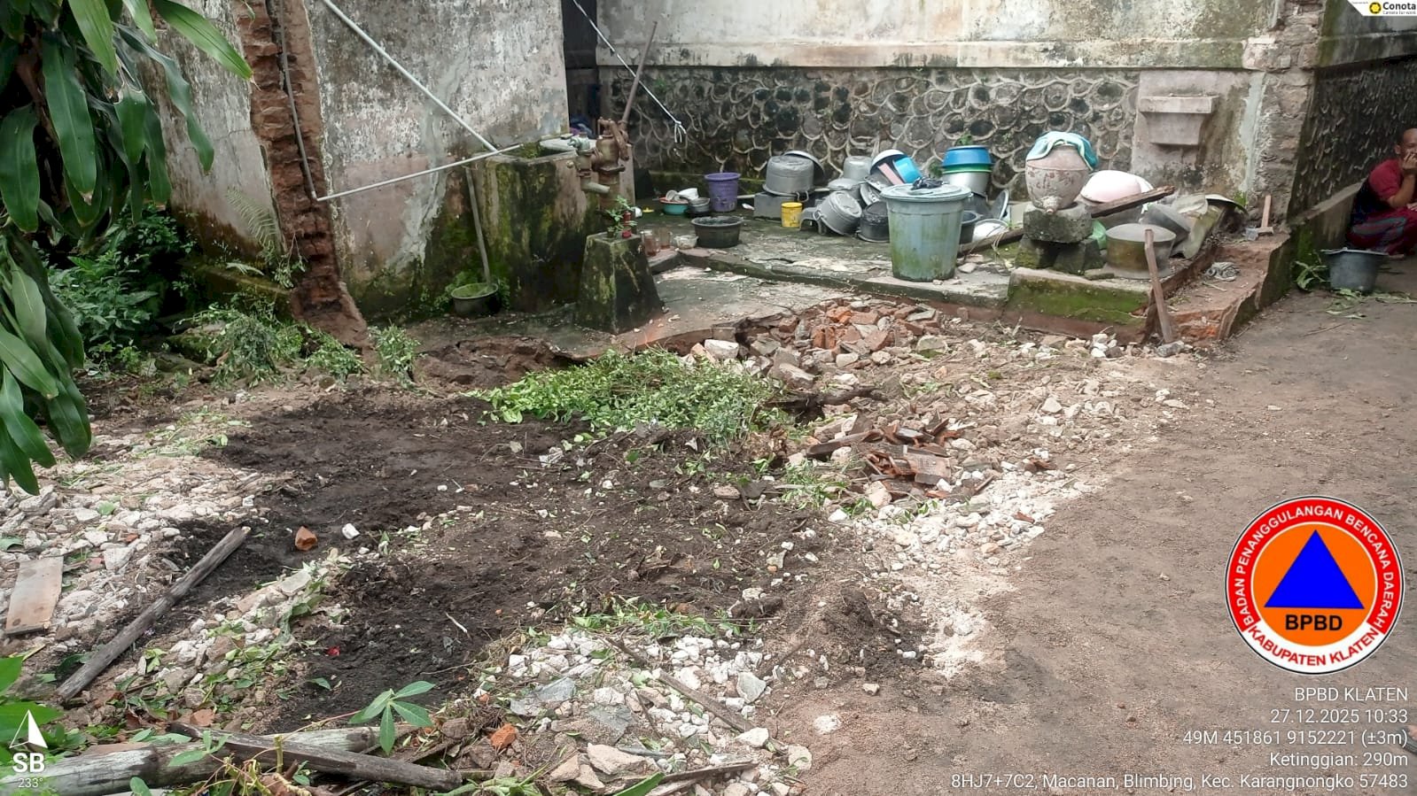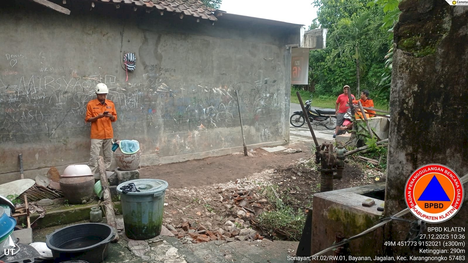 Berdasarkan hasil assessment yang dilakukan oleh Tim Reaksi Cepat (TRC) Badan Penanggulangan Bencana Daerah (BPBD) Kabupaten Klaten, pada hari Jum'at (26/12/2025) terjadi hujan deras dari pukul 01.30 WIB sehingga aliran air masuk ke dalam sumur mengakibatkan dinding sumur terkikis lalu ambrol sedalam 12 meter.